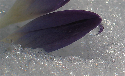 Krokusse im Schnee, hier eine Nahaufnahme.