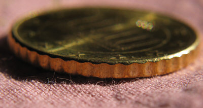Eine Euro-Münze, die im Licht diesen grünen Schimmer hat ... unten in