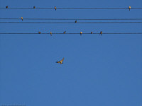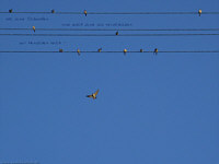 Schwalben auf einer Stromleitung mit Text