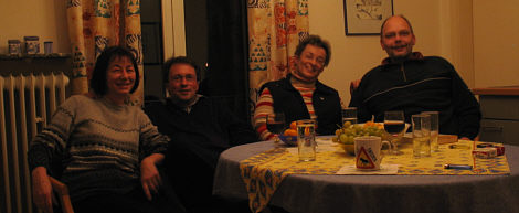 Hat jemand von Euch gestern "nicht" auf die Kugel, sondern auf den Link darunter geklickt ? Und sich gewundert, dass dort dasselbe Adventskalendertürchen wie vorgestern zu finden war ?? Wenn ja ... bitte in Zukunft nicht nur wundern, sondern mir Bescheid geben. Wer also noch nix von Tirilli gelesen hat, wie sie Weihnachten in Chile feierte, der darf das gerne nachholen ... hier :). -- Frank ... ist Euch dieser Name schon mal hier in den Kommentaren begegnet ?? Bestimmt ... wir haben zwei Franks hier ... den einen meine ich ;). Der, der in St. Ingbert wohnt und montags im Chat zu finden ist. Zum Frank gehört die Teresa. Und wenn Beate und ich die zwei besuchen, sieht das so aus: ![]() Nein, Frank ist nicht so klein, er ist nur tief in seinen Stuhl gerutscht. Und ich bin nicht so groß, ich hatte keine Zeit, in mich zu sinken, schließlich muss ich bereits sitzen, wenn der Selbstauslöser loslegt. Teresa ist übrigens ein Multitalent, was Malen (und mehr betrifft). Das ist z.B. ein Bild von ihr: ![]() Da diese Wunder der Natur auch zum Angreifen bei den Zweien zu finden sind, und ich so gaaanz zufällig meine Kamera dabei hatte (*gg*), gibts nun noch ein Bild, gleiches Motiv, aber nicht gemalt: ![]() -- Und nun zur Kugel, hinter der aber nicht der Frank zu finden ist ;).