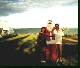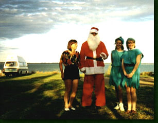 Weihnachten auf eine vollkommen neue Art feiern. Nun kommen wir ins Gespräch. Sorry, auch der New Zealand Weihnachtsmann war nicht der auf den wir immer noch warten, sondern er und seine Engel waren Studenten, die eine kurze Rauchpause einlegen wollten, um dann die Geschenke an die weiter weg liegenden Farmen auszuteilen. Nun schaun wir uns das mal an, denn die Kamera war diesmal zum Glück dabei. Es gibt Zeiten, auch Weihnachten, da ist der Fotoapparat wech und Digital gab es Mitte der 80er nicht für den „Otto-Normalbürger“. Am 24. 12. sitzt die Familie , Teresa, Eltern, Oma und Opa, Frank und Nichten und Neffen gemütlich und ohne Stress bei Kaffee und Kuchen, den die „Bescherung ist erst so gegen 18:OO Uhr. Der dekorierte Weihnachtsbaum (immer nen echter, bitte kein Kunststoff) stand auf dem Balkon und fror. Der Balkon wurde „damals“ von cleveren Leutchen natürlich auch zur Lagerung von Weihnachtsspeisen verwendet. Um die Zeit
