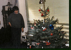Einen Weihnachtsbaum haben wir immer, er reicht bis zur Decke. Behängt wird er mit Holzfiguren aus dem Erzgebirge ;-), Strohsternen, und bestückt wird er grundsätzlich mit echten Kerzen. Die Spitze trägt unser Tannenbaum stets in "natur". |