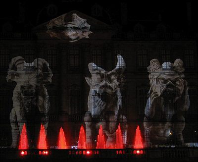 Ebenfalls rote Fontäne, aber andere Bilder ans Haus projeziert.