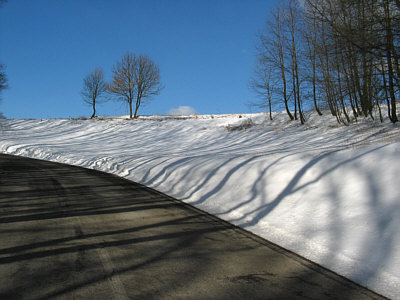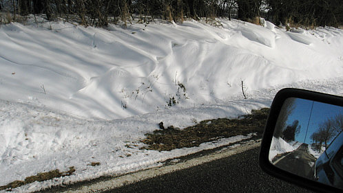 Auch der Baumstumpf im Schnee, direkt an der Straße: