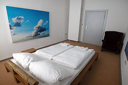 Über dem Bett hängt ein Spiegel, in dem man sich in ganz anderem Licht