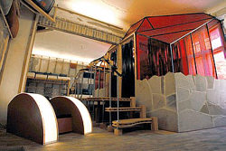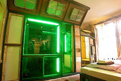 Mitten im Zimmer steht ein Haus aus grün gefärbten Glas