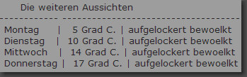 Montag 7, Dienstag 11, Mittwoch 15, Donnerstag 17 Grad.