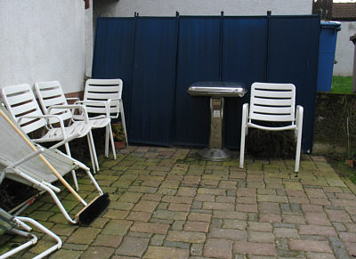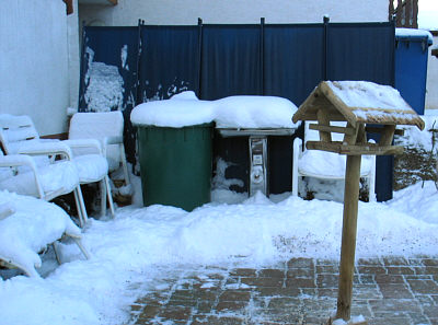 Plastikstühle, Regentonne, Grill, Vogelhäuschen, Schnee