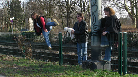 die jungen Männer werfen erstmal den Hund über den Zaun
