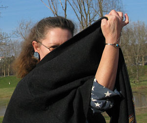 Die Dame hinter dem Tuch mit den Sternen am Arm.
