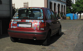 die jemand aus dem Urlaub mitgebracht hat, auf das Auto klebt.