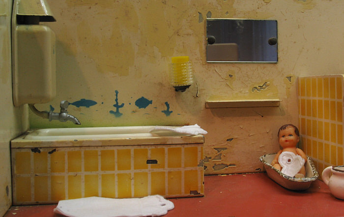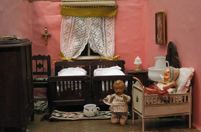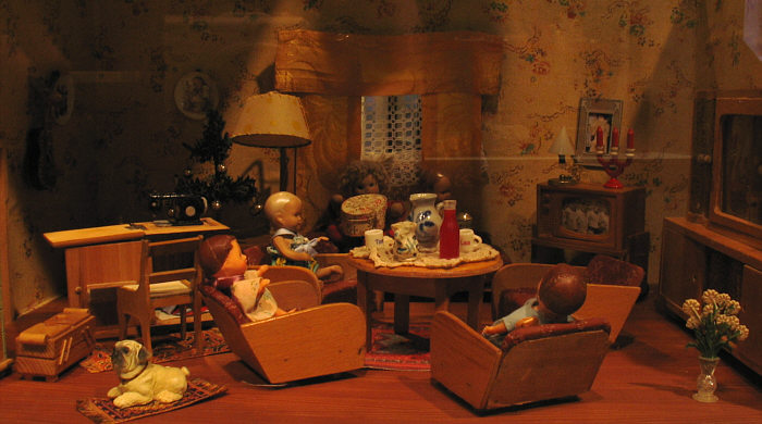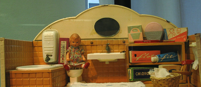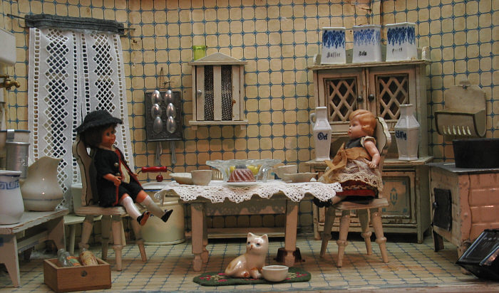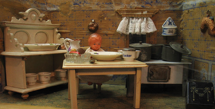 Heute gibt es eine kleine Nostalgiereise, bei der es richtig viel zu entdecken gibt :)). Ein Blick in fremde Wohnungen, die aber ganz klein sind. Man kann sie fast in die Handtasche stecken. Puppenstuben aus alter Zeit ... wir fangen mit dem Jahr 1960 an: ![]() Ein Blech(!)badezimmer ... mit den Original Crems und "Kosmetika". Auf dem Töpfchen sitzt die Lieselotte und aus dem Boiler kommt bestimmt gleich warmes Wasser ;). Das nächste Zimmer ist die gute Stube Mitter der 50er Jahre: ![]() Ach herrje ... im Fernsehgerät läuft gerade die WM. Der Hund sitzt auf dem Läufer und daneben ein Nähkorb wie ihn meine Mutter auch hatte. Die Nähmaschine ist versenkbar (!) und alles in bester Ordnung ... ... denn wir wissen ja, dass Deutschland im Endspiel gewinnt ;)). Jetzt aber schnell nochmal ins Bad ... von 1950: ![]() Alleingelassener Jüngling wartet auf die Mutter. An der Wand Malereien und ebenfalls ein Boiler. kleiner Zeitsprung ins Jahr 1920: ![]() Waschschüssel, Lampe und Nachttopf sind aus altem Lauschaglas und das Bettchen rechts aus Blech. Zwei Kinder aus einer toleranten Ehe, die Völkervständigung praktiziert ;). Nun aber genug geschlafen, jetzt gehts in die Küche des Jahres 1912: ![]() Gardinenstangen sind aus Löffelblech und noch original. Auch Tapeten und Boden sind in unrestauriertem Originalzustand. Tante Hilde sitzt mit Nichte Marianne am Tisch und die Katze wartet auf ihr Futter. Oben rechts sind Kaffee, Reis und Gries zu finden ... ja, das gabs damals auch schon ;)). Und nun zur ältesten Stube, wir schreiben das Jahr 1910: ![]() Gedankenverlorenverträumt harrt dieses junge Mädchen der Kommentare, die nun kommen mögen *gg*. Euch Allen einen schönen Sonntag :))