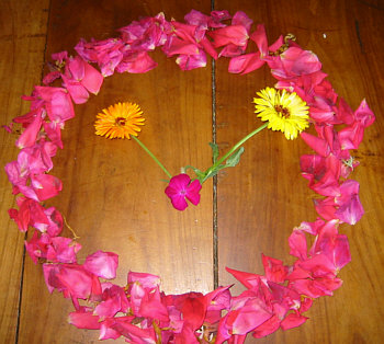Umrahmt von Rosenblättern mit Zeigern aus Gerbera