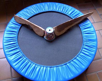 auf einem Trampolin zeigen Holzscheite die Zeit an