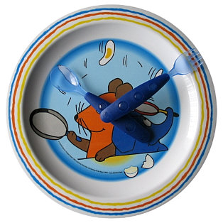 Kinderteller und Kinderbesteck und davor sitzt ...