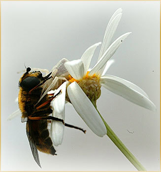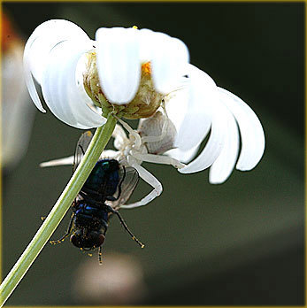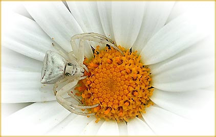 mit weit ausgestreckten Fangarmen, direkt in der Blüte sitzend,