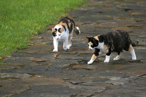 Diese beiden Katzen leben bei einer kleinen Kirche.