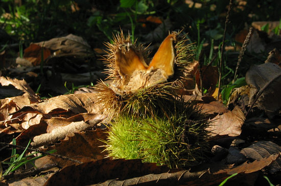 In der Nähe von Homburg, am Waldrand, steht ein Esskastanienbaum.
