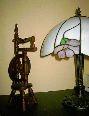 Ein kleines Spinnrad, das hier in schönem Tiffany-Ambiente zu finden