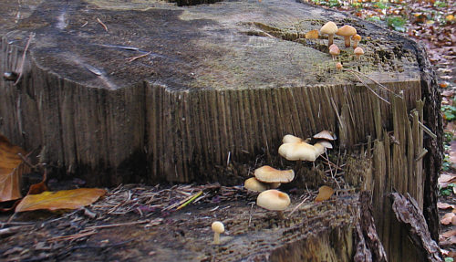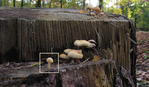 Auf zwei Etagen wachsen hier die Pilze ... ein ganz besonderer Pilz ist ... ... der kleine da unten. Denn wie kaum etwas Anderes symbolisiert er das erwachende Leben: Wir gehen weiter, an den zwei Tänzern vorbei ...