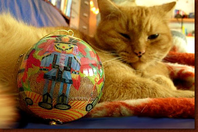 Kritisch-müde vom lamettagoldenen Stubentiger beäugt.