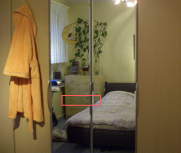 von Nachtschränkchen, das sich in der Tür spiegelte. Und ... auch hier