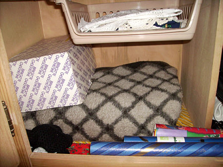 Ja, so siehts unten in den Schränken aus ... Wolldecke, gehäkelte