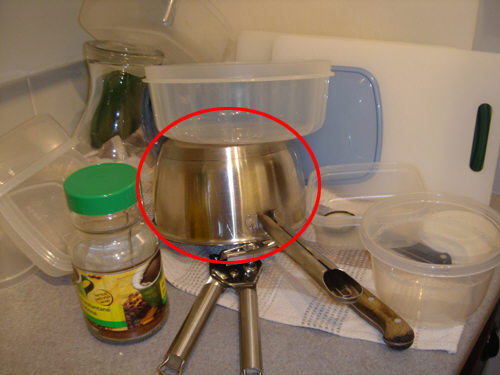 Ich gebe einen Kaffeelöffel Pulver in eine grosse Tasse, etwas kaltes