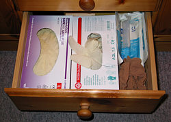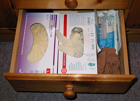 Zwei Schachteln mit ungepuderten Plastikhandschuhen. Und nun lese ich