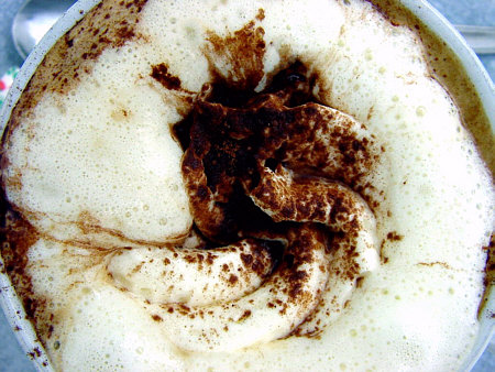 Wie nett ... ein Cappu. Mahlzeit. Prost Mahlzeit. Appetitlich ? Nun ja ... so sieht Cappu aus, wenn man den richtigen Fotografierzeitpunkt verpasst. Na wenigstens ist das hier eines der doppelten Bilder. Zwei Cappus sind ja besser als einer. Klick