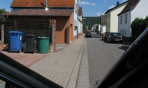 Der Blick durch die geöffnete Autotür zu unseren Mülltonnen, der