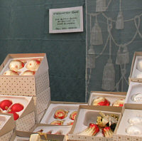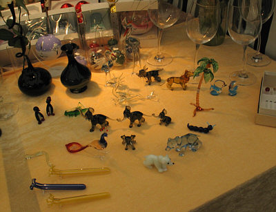und fragt die Dame an dem Stand, ob sie die Glasdekorationen selbst
