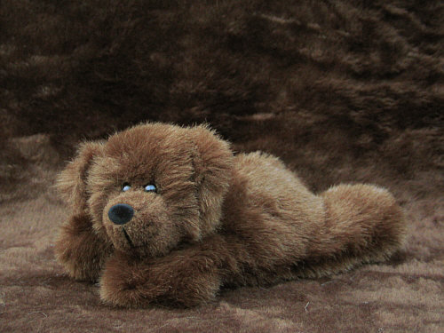 Fell: Mohair gebatikt, dunkelbraun mit helleren Stellen.