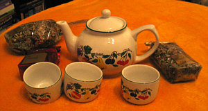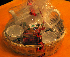 Im Korb: eine kleine Teekanne, 3 henkellose Tassen und 3 Päckchen Tee.