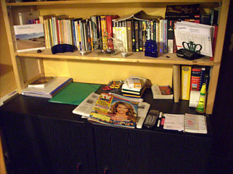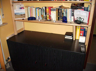 Flurschränkchen und auf der Ablagefläche unter dem Bücherregal liegt.