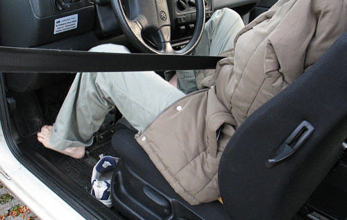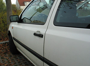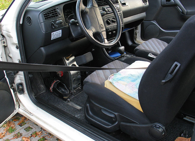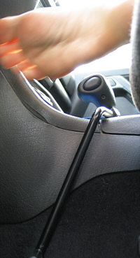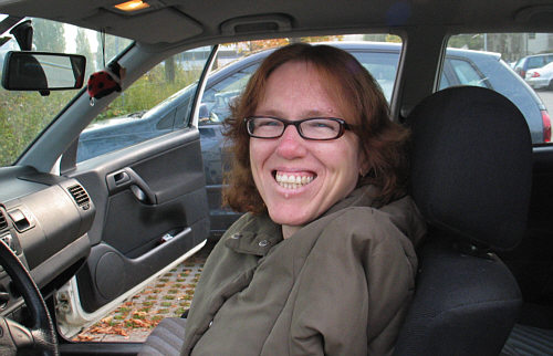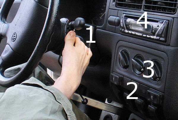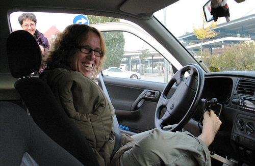 Dieses Auto ... ![]() ... ist leider nicht Gises neues Auto. Das wäre schön, ist aber nur ein Wunsch, denn diese Bilder ... ... wurden am 12. Oktober 2007 fotografiert. Zu einer Zeit, wo Gises Golf noch ganz ganz war. Es war einen Tag vor dem Tübinger Seelenfarbentreffen, als ich die Gelegenheit ergriff und meine Neugier befriedigte. Denn die große Frage lautete "wie fährt jemand, der keine Arme hat, Auto ?" Denn man macht so einiges mit den Händen, wenn man welche hat. Blinken, schalten, lenken, einige Knöpfe und Hebel drücken bzw. drehen. Und nun lassen wir doch mal die Gise ins Auto einsteigen. Mit beiden Beinen fest auf dem Boden ... ![]() ... zieht sie erst mal den Schuh aus ... ![]() ... und nimmt den Schlüssel in ![]() Ein Schlüssel, der etwas anders aussieht: ![]() Warum ist der so flach ? Weil er so am besten transportiert werden kann, denn Gise trägt ihren Schlüssel unter der Fußsohle im Schuh mit sich herum. Hat einen großen Vorteil: der Schlüssel ist immer fußwarm ;). Tür auf ... ![]() ... der Gurt hängt am Holm. Das muss so sein, wie sollte Gise sonst den Gurt anlegen ? So setzt sie sich einfach, schließt die Tür mit dem Fuß und ist schon angegurtet. Und nun die spannende Frage: wie sieht das Auto innen aus ?? ![]() Das schauen wir uns jetzt alles mal genauer an: ![]() Da ist ja ein Schuh drin ... das ist auch besser so. Denn der Schuh ist festgebunden, damit er nicht fortläuft. Und runterfallen darf er auch nicht ... denn damit wird gelenkt. ![]() 1 - durch Drehbewegungen mit dem linken Fuß wird gelenkt. 2 - Knopf für die Innenbeleuchtung 3 - Extra-Gebläseknopf (schaltet Stufe 4 an für schnelle Freiheit der Scheiben) 4 - schauen wir uns mal näher an: ![]() Unten der Knopf ist für das Fernlicht (wird mit der Ferse bedient, geht auch während dem Gas geben) Und oben ist auch noch ein Schalter ... für die Handbremse (die mit dem Waffenschein, siehe weiter unten). Etwas weiter oben ... ![]() ... da gibt es 1 - Kniehaltebremshebel, damit das Auto nicht durch die Automatik weiterrollt, wenn man z.B. den Rückwärtsgang einschalten will 2 - der Hebel mit der Kugel dran für den Scheinwischer (der Hebel ist die Verlängerung vom normalen Scheibenwischwaschhebel) 3 - andere Kugel, das ist der Blinker (auch ein Verlängerungshebel) So sitzt die Gise drin ... ![]() ... und so startet sie das Auto: ![]() Ja, es stimmt, die Tante Ilse schaut zu ;)). Neben dem Lenkrad ... ![]() ... gibt es 1 - der ganz normale Scheibenwaschhebel, da geht die oben beschriebene Verlängerung ab. 2 - die an sich normalen, aber etwas größeren Tasten für die Fensterheber Untendrunter die Schalter für Warnblinkanlage, Nebelschlussleuchte und Fahrlicht 3 - normale Drehregler für die Temperatur 4 - so groß müssten die Knöpfe aber gar nicht sein, denn Gise hat kein Problem, die Miniknöpfe ihres Autoradios zu bedienen ;)). Gas geben und Bremsen ... ![]() ... funktioniert weitgehend normal. Fährt Gise immer barfuss ?? Nein ... das war nur fürs Foto, um die Schönheit ihres Fußes zu zeigen. Normalerweise hat sie schon einen Schuh an. ![]() Hier lenkt sie gerade (so ähnlich wie linksbeiniges Fahrradfahren). Dieser Hebel ... ![]() ... fehlt noch in der Sammlung. Er ist am Schaltknopf des Automatikgetriebes zu finden ... ![]() ... und damit kann man eben schalten. Oben das helle ist der gemeine Huschfuß. Und das ... ![]() ... sieht so aus, als wenn man dafür einen Waffenschein braucht, doch das ist nur die Handbremse. Etwas anders als normale Handbremsen, denn sie ist elektrisch bedienbar (siehe Schalter, wie weiter oben beschrieben) Gise ... ![]() ... ist eine sehr freundliche Autofahrerin. Eine Kavalierin der Straße, denn sie hat noch nie jemand den Vogel gezeigt ... stimmts *fg* ? Und wie war das eigentlich mit der Sonnenblende ? Die zieht sie mit dem Fuß runter ... da kennt sie gar nix. So gelenkig müsste man sein ;)). Und nun wissen wir alle, wie man ohne Arme Auto fahren kann. War auch für den Fotografen eine sehr interessante Sache :). |