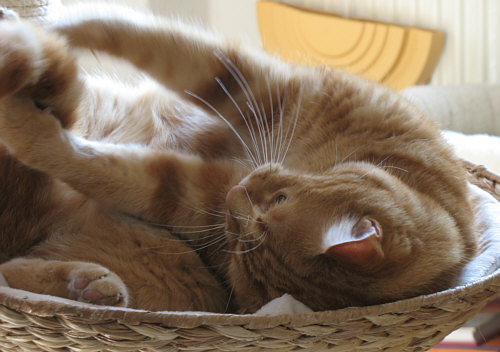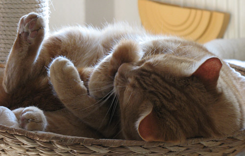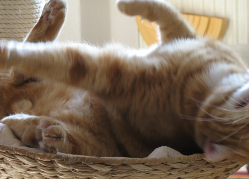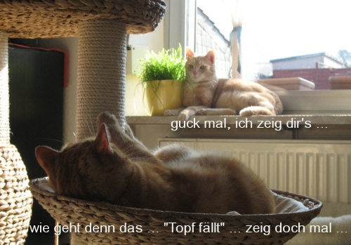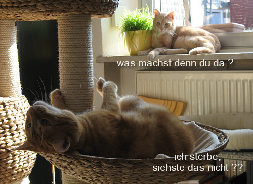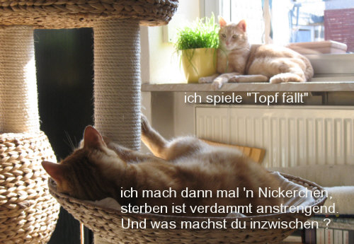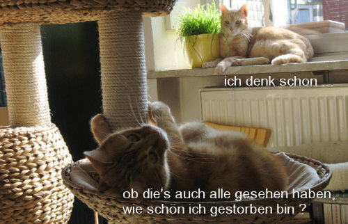 Ich bins mal wieder ... der Mickey. Aber leider zum letzten Mal. Ich bin der liebste Kater unter Gottes Sonne und der harmloseste, netteste Vertreter der Spezies "Stubentiger". Erinnert Ihr Euch ... als mich vor ein paar Tagen die Beate aus der Schweiz entführt hatte und mir dann auch noch vor knapp einem Monat alle Eier abgerissen hatte ... so sah das damals aus: ![]() Ich musste mich tot stellen, damit sie von mir abließ. Und nur dadurch hatte ich dann knapp überlebt. Gnadenfrist ... sag ich Euch. Gerade mal vier Wochen lang. Dann schlug die Beate wieder zu ... aber ganz perfide. Es hätte mir verdächtig vorkommen müssen, dass sie in den letzten Tagen das Buch "die Geschichte des Schlangengiftes" gelesen hat. Richtig vergraben hatte sie sich in diese Seiten. Und ich habs nicht gemerkt ... viel zu vertrauensselig bin ich geworden, nur weil mal ein paar Tage Ruhe herrschte. Die Ruhe vor dem Sturm. Oder besser: die Ruhe vor dem Gift. Da putze ich nichtsahnend meine Pfoten ... ![]() ... werde ein wenig müde ... dussele etwas ... ![]() ... und gerade als ich einschlafen wollte, fällt mir ein " Dann aber schnell das Teil zwischen die Pfoten nehmen ... ![]() ... und mit voller Konzentration putzen ... ![]() ... und putzen und nochmal ... ![]() ... putzen. Man ist ja schon sauber als Kater. Ich dachte noch "schmeckt aber komisch" heute, doch gerade dann wenn der Schwanz komisch schmeckt, muss man ihn besonders gründlich putzen, damit er sauber wird ... ... ich konnte ja nicht ahnen. ![]() Hier ... das war die letzte Sekunde, in der ich mich noch gut gefühlt habe. Blöder Geschmack auf der Zunge, aber der Schwanz war fast sauber. Bis mir dann anders wurde ... "Schlangengift am Schwanz" ... schrie es auf einmal in mir ... ... doch es war schon zu spät. Mir wurde schwindlig und schwach ... ![]() ... und dann drehte sich alles. ![]() Ich bäumte mich ein letztes Mal auf ... ![]() ... schon war ich tot. ![]() So schnell kanns gehen ... da kriegste noch nicht mal mehr die Zunge ins Maul zurück. ![]() Das wars ... man sieht sich im nächsten Leben. Kamera aus. Sense(mann). . . . . . . . . . . . . . . . . . . . . . . . . . . . . . Mickey hatte doch tatsächlich geglaubt, dass ich die Kamera ausgemacht hätte. Aber er konnte ja nicht nachschauen, er musste ja, damits glaubwürdig ist, die Augen geschlossen halten ;)). Ich tat so, als würde ich meinen traurigen Kopf in den Händen verbergen, doch mein Finger lag immer wieder auf dem Auslöseknopf. Man ist ja schon clever ;)). Denn kurze Zeit später: ![]() ![]() ![]() ![]() ![]() "Topf fällt" schreit auch in diesem Moment meine Frau Beate und ich konnte nur noch "Moment mal" zurückschreien, schnell das Bild machen und gerade noch rechtzeitig rückte Beate dann den Topf wieder gerade. Mickey bekam das gar nicht mehr mit ... denn er war eingeschlafen. Er träumte schon von seiner nächsten Paraderolle ... ![]() ... der des Grafen von Krolock im "Tanz der Vampire". Auch Mogli schlief inzwischen, auch er träumte einen großen Traum. In diesem spielt er mit großem Erfolg den "Gabriel von Eisenstein" in der Operette ... ![]() ... die Fledermaus. |