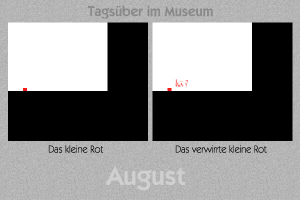 ![]() 2005 man kann auch mit Gerümpelbildern Kalenderblätter machen 2006 eine auch autobiographische Wort-Bild-Kombination ![]() Ein bißchen dada, ein bißchen Abstrakt, ein bißchen moderne Kunst. Das eine Wort soll "hä ?" heißen und ein Verwirrtheitsruf sein. Denn auch kleine rote Quadrate haben eine Stimme ;). Apropos rote Quadrate ... ich hab grad ein Deja Vu ;)). Aber damals wusste ich von Herrn Malewitsch noch nix. -- September