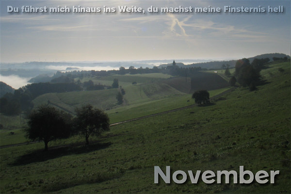 ![]() 2005 ein schöner Abend, verdammt gutes Essen, guter Wein, schöne Farben und ein schönes Kalenderblatt, an dessen Versen ich lange gefeilt habe. 2006 ein Liebig-Sammelbild und eine Rose ... Nostalgie und Gegenwart ![]() Warum nicht mal Worte aus der Bibel (hatte ich ganz vergessen dazu zu schreiben) ... Worte aus dem Psalm 18 ... dazu diese magische Landschaft eines Tages auf der Sickinger Höhe. -- Dezember