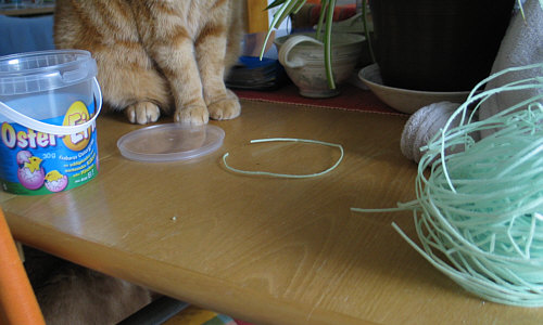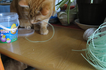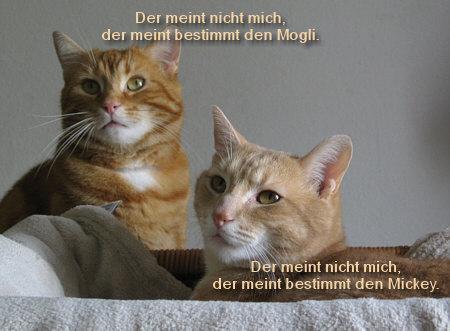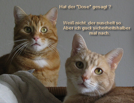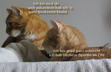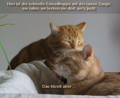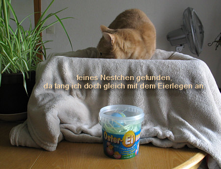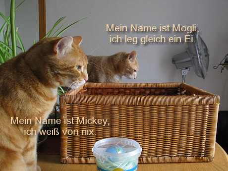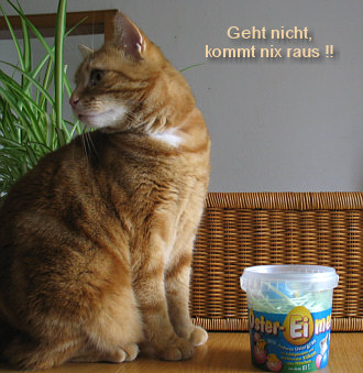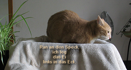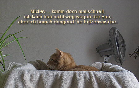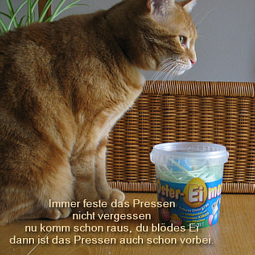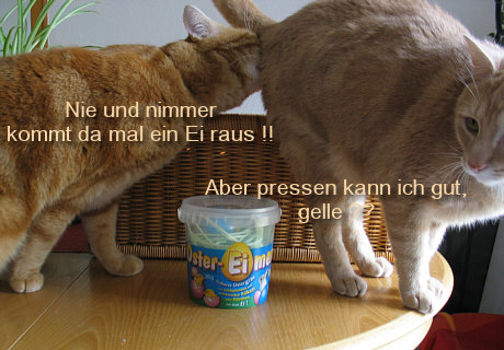 Sagt doch bitte mal alle "da steht ja ein Ventilator". ![]() Dankeschön. Das wäre nun gesagt und muss nie wiederholt werden. Denn dort, wo ich fotografiert habe, steht hinten an der Wand ein Ventilator. Für den Sommer. Steht er da. Weil ... er eben da steht. Da ich keine Lust habe, ihn immer wegzuretuschieren, steht er nun auch sichtbar da. Jetzt an Ostern ist er ausgeschaltet. Weil Ostern diesmal wie Weihnachten ist. Vor dem Ventilator steht ein Tisch. Auf dem Tisch da steht ein Korb. ![]() Da fehlt jetzt noch eine Decke. Denn der Korb mit der Decke drauf soll der fotografische Hintergrund sein. Hintergrund für eine etwas satirische, seltsame, blaue Osterüberraschung. Denn ich hab da etwas gekauft. Extra fürs Kalenderblatt. Alles im Eimer. ![]() Und was da genau drin ist, das schauen wir uns gleich mal genauer an. Der Eimer. Der Korb. Der Ventilator ... ![]() Los gehts, die Kamera ist bereit, wir nähern uns ... ... ähm, ich würde sagen, "mir" nähert sich was. Wie schön ... ![]() ... pünktlich zum Feste ist mindestens ein Osterhase gekommen: ![]() Kaum hatte ich mich von dieser Überraschung erholt, passierte auch schon folgendes: ![]() Das war wohl eher eine Luftnummer *fg*. Mogli verschwindet verschämt ... und schon wissen wir, dass auch Mickey ein Osterhase ist. ![]() ![]() Hmm ... auch nix. Hüben wie drüben heißt es üben, üben, üben. Auf jeden Fall bin ich endlich wieder alleine. Endlich !! Endlich kann ich mit dem Fotografieren anfangen. Denn nichts anderes hatte ich im Sinn. Es geht um diesen Eimer und um ein Ei, das in ihm zu finden ist. Ein schönes, leicht satirisches Osterthema. Katzen wollte ich heute ausnahmsweise nicht fotografieren. Tja ... wollte ... aber es kam ja anders. Doch jetzt ... ist endlich mal Ruhe. Sogar die Decke liegt über dem Korb ... ![]() ... und gleich fange ich mit dem Fotografieren an. Hey ... was ist denn das schon wieder ? Der erste Osterhase ist zurückgekehrt. ![]() ![]() Eine Minute später reifte eine ganz wichtige Erkenntnis: Eierlegen macht schmutzig hinter den Ohren !! Denn: ![]() Nur Sekunden später: ![]() Weiter ging die Intensivreinigung: ![]() Irgendwann wurde mir das aber alles zu blöd. Ich hab doch nicht die Zeit, minutenlang in die Waschanlage zu schauen. "Hey, ihr Zwei ... habt Ihr nix Besseres zu tun ??". ![]() ![]() Da griff ich zu einer List und sagte "Ihr allerliebsten Stubentiger dieser Welt ... schnurri burri ... ... geht doch mal in die Küche ... ganz bestimmt ist dort die liebe Beate und macht Euch etwas Feines zu essen !". ![]() Und schon verschwand Mogli in Richtung Küche. Und Mickey ihm nach ... man könnte ja etwas Essbares verpassen. Und ich ? Ich konnte mich endlich mal mit dem Eimer befassen: ![]() Ein Oster-Eimer ? Nee, ein Oster-Ei-mer ? Denn da ist ein Ei drin. Und Gras. Das Ei ist blau, das Gras ist grün wohin das führt, wird man sehn. Worum gehts denn genau ? Um ... ![]() ... Gras, das essbar ist und um ein Küken, das aus einem Ei schlüpft. Aber nur, falls es nicht doch zu einem Häschen mutiert. Dieser Text klang für mich so seltsam, dass ich wissen wollte, was das ist und wie das funktioniert. Also erstmal die Bedienungsanleitung lesen: ![]() ![]() Hey, sag mal ... kennen wir uns ? Da wirst du ganz einfach und ungefragt von der Bedienungsanleitung geduzt. Aber Schwamm drüber, in China duzt man vielleicht früher. Also ... Ei in kaltes Wasser werfen, warten. Das sollte durchaus machbar sein ... ich geh dann mal ein Glas holen. Nee, halt ... erstmal Ei und Gras im Usprungszustand fotografieren: Der Eimer, noch verschlossen. ![]() Der Inhalt ohne Eimer drumrum: ![]() Aha ... so sieht das also aus. Das Gras ... und das Ei: ![]() Dann wollen wir mal das Ei ins Wasser legen. Damit das Tierchen rauskommt. Eine Art Unterwassergeburt also. Aber was ist, wenns geschlüpft ist ... Hunger hat ... und an meine Brust will ? Okay ... warten wirs erst mal ab ... ... und kriegen erstmal selber Hunger. Dieser Hunger lässt uns auf einmal ganz klar denken und die Erinnerung uns ein Bildchen schenken: ![]() Hey ... ja ... genau ... apropos Hunger ... das wäre doch eine gute Idee, wenn ich da mal ... ... ins Gras beißen würde. Gedacht Gesagt Getan ![]() Ihr werdet es kaum glauben, aber man kann das Gras wirklich essen. Fühlt sich an wie die Obladen in der Kirche, schmeckt aber viel süßer. Wenn man sonst nix hat und gleich verhungern würde ... ... apropos verhungern würde ... der Fressfeind naht *gg*: ![]() Mein ganzes schönes Abendessen war in Gefahr. Zuerst kam Mickey ... ![]() ![]() ... und der zweite Feind lauerte da schon unterm Tisch (links unten). Und dann kam Mogli: ![]() ![]() Sachen gibts, die gibts nicht. Und doch gibt es sie. Ich flehte. "Oooh, gibt mir mein Gras zurück" Ich kniete. Ich kniete und flehte. Da kam Mogli zu mir ... schaute mir tief in die Augen ... ![]() ... und sagte: "Okay, du kriegst dein Gras ... unter einer Bedingung". "Was muss ich denn tun" "Mach uns den Loriot !!" Und so kam es, dass ich mit unendlich trauriger Miene das tat, was ich tun musste, damit ich mein Gras behalten durfte ... ich machte ihnen den Loriot: ![]() Könnt Ihr Euch vorstellen, wie ich mich geschämt habe ? Könnt Ihr Euch vorstellen, wie sehr die Katzen über mich gelacht haben ? Und das Schlimmste ... zum Abschluss meinte Mogli noch süffisant: ![]() "Denk dran ... vor dem Essen das Beten nicht vergessen". Daraufhin wollte ich nicht mehr ins Gras beißen, packte meine Kamera und ging wieder dort hin, wo ich her gekommen war. |