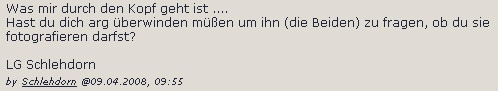 Wie war das eigentlich für mich ? Diese Begegnung mit Udo ? Schlehdorn hat da die richtige Frage gestellt: ![]() Sehr sehr gute Frage ... wie war denn "meine" Begegnung mit dem Herrn. Obwohl Beate dabei war, ist es doch "meine" Begegnung gewesen, denn Beate war zu diesem Zeitpunkt nicht an meiner Seite, sondern ein paar Meter weiter. Beide fotografierten wir ... ich natürlich auch ... wie immer ;)) ... aber nicht den Udo. Kommt doch mal mit. |