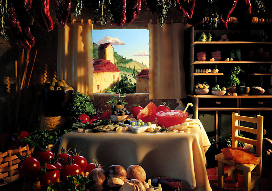 Aus der Tomate trinken, in die Nudelvorhänge beißen ... falls das Nudelstoff ist. Man könnte auch in die Tischdecke beißen ... nur woraus ist die ? Ich spekuliere Mal: Schmelzkäse. Ich glaube, es wird Zeit für unseren Morgenspaziergang ...