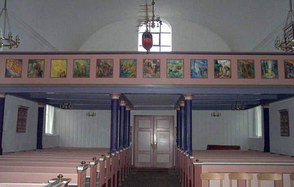 In der Kirchen empfangen uns sanfte Rosenholztöne und bunte Bilder:
