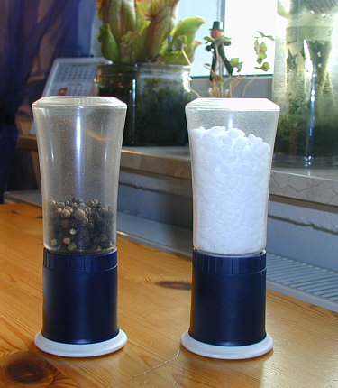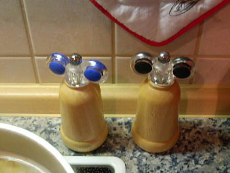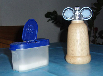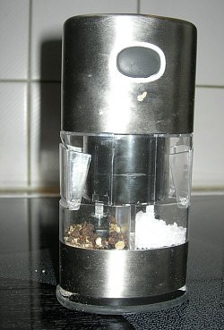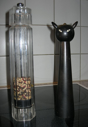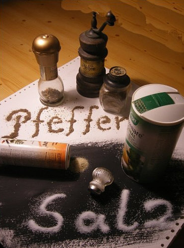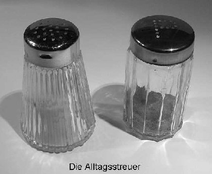 Heute ist ein besonderer Tag ... denn was am 16. Januar begonnen hat, fand doch tatsächlich 5 weitere Fortsetzungen bis tief in den Frühling hinein und heute gibts nun die letzte Folge der seelenfärblerischen Salz- und Pfefferstreuer Folge 6 ( Folge 1 - Folge 2 - Folge 3 - Folge 4 - Folge 5 ) -- Klaus legt los ... mit diesen Streuern: ![]() Da hat er die Info schon drauf geschrieben ... das sind die für jeden Tag und fast jedes Ei ;). ![]() Wenn im Topf das Wasser zu Kochen beginnt, fangen die Reiskörner im Streuer schon an, unruhig zu werden ;). ![]() Und die Mühle gibts auch noch. Was aber, wenn Besuch kommt ? Dann tauchen die obigen Exemplare nicht auf, dann wird ein ganz besonders feiner Streuer auf den Tisch gestellt: ![]() Eleganz pur und die 2 in 1-Lösung. Ob er auch so praktisch wie schön ist ? Oder kommt da immer gleichzeitig Salz "und" Pfeffer raus ? Zu diesem Bild gibts noch eine Geschichte ... da habe ich nämlich den Klaus angemailt und ihn gefragt, ob er das selbst fotografiert hat. Ich war mir fast sicher, dass das nicht der Fall ist, denn das Bild sieht aus wie professionelle Produktfotografie und ich dachte, dass wäre von der WMF-Seite oder so. Doch, kaum zu glauben ... das hat der Klaus selbst fotografiert. Mit "etwas Beleuchtungsaufwand", wie er sagt. Ja, und dann das ... ich finde die Version da oben schon richtig gut, doch Klaus schickte mir eine weitere Mail, neu fotografiert und "bitte austauschen". Nee, ich tausche nicht, ich setze dazu :) ![]() -- Männer sind hier in der Minderheit. Darum kommt jetzt ... Werner ;)). Ja, das gibts wirklich, zwei Männer hintereinander und auch noch hier *gg*. Männer sind sich ähnlich ? Da hätte ich bisher "stimmt nicht" gesagt. Doch nun überrascht mich der Werner mit genau derselben Aufteilung wie "Streuer für den alltäglichen Gebrauch", "für den Besuch" und dann hat er auch noch fast die gleiche Mühle wie der Klaus: ![]() Beides für die Gäste, in der Katze ist übrigens stilgerecht schwarzer Pfeffer zu finden. Für alle Tage sind die da: ![]() Und da ... ![]() ... da ist 'ne Batterie drin. Das ist die moderne Welt der Schweizer Küche ;). Apropos Mann ... kennt Ihr diese Sprüche a la "wer hat den längsten" ?? Wollte nur wissen, ob ihr den Spruch kennt, aber nicht näher auf das Thema eingehen. Sondern noch zwei weitere Mühlen von Werner zeigen *fg*. ![]() Nein, die linke Mühle kann man nicht vom Stuhl aus verwenden. Dazu muss man aufstehen und erst mal einen Schritt zurück gehen. Aber man bleibt sitzen und kann wunderbar des Nachbars Teller pfeffern ;)). -- Wo wir gerade bei der aufwändigen Fotografie waren ... Dinge ins rechte Licht zu rücken, ist eines ... aber mit Salz und Pfeffer ein Stillleben zu malen, nochmal etwas anderes und eine ganz Ecke aufwändiger, aber das Ergebnis lohnt sich: ![]() Die Streuer- und Mühlenkollektion von Claudia. Die kleinen Streuer haben noch einige Geschwister, so das jeder bei Frühstücksei seinen eigenen Streuer hat. -- Ob Fragolas Streuer schon 40 Jahre alt sind ? Eher nicht ... denn sonst hätten wir sie bestimmt bei "Raumschiff Orion" gesehen ;)). ![]() Daraus sind früher Raumstationen entstanden ... oder so. Sind übrigens nie benutzt worden, diese Streuer. Fragola hatte sie entdeckt, als sie Dinge zum Verkaufen bei Ebay zusammengestellt hat. -- Manche Streuer sind keine Streuer, sondern ... Eier: ![]() Da freut sich das Frühstücksei, wenn es diese runden entfernten Verwandten sieht. Aber es freut sich nur kurz ... eine Minute oder so ... dann ist das Ei gegessen. Seufz ... nur nicht traurig werden ... lieber an Elefantentänze denken ;)). Wo wir gerade beim Thema sind ... Birgit hat auch diese Streuer: ![]() Da freut man sich, wenns was zu salzen und pfeffern gibt :). -- Und wir werfen einen Blick ![]() Tupper ... den Namen hatte wir ja schon öfter gehört. Vielen haben solche Streuer aus Kunststoff ... dass es aus diesem Material aber auch Mühlen gibt, ist mir neu ... doch es gibt sie. Weil sie schon klein, weiß und neutral sind ... ![]() ... und dadurch immer passen, sind das die Streuer für den Tisch. Ihr werdet es nicht glauben, wie Sabine Eva zu diesem Streuern kam ? Gewonnen ! Bei ... Granini ... zusammen mit einem 2-Personen-Frühstücks-Service. Von diesem Service sind aber nur noch ... die Streuer übrig. -- Nun zu den Streuern von "Windblau". Ob sie blau sind ? Keineswegs ... denn blau ist die Farbe, die bei diesen Streuern so überhaupt nicht vor kommt: ![]() Gestatten: Henriette und Henrietta Huhn. -- Marion (Rucksackgrille) hat neben den ganz normalen alltäglichen Streuern ein paar besonders originelle Vertreter zu Hause: ![]() Grüner Spargel ![]() Rundflügelmühlen (die hatten wir übrigens schon mal, habe ich gerade per Zufall gesehen, bei der Irene aus der Schweiz: ![]() Ist schon interessant ... in Dresden und in der Schweiz gibts die gleichen Streuermodelle. Weiter mit Marions Streuern: ![]() Minimini-Streuer ![]() die kleine Schweinerei ![]() und die beiden Enten (und das Radieschen, das aber nicht streut). Na, was sage ich ... ein tolles Thema ... und auch in der 6. Folge gibts neue Variationen und interessante Streuer und Mühlen. -- Katinka wünscht sich, dass die Salz- und Pfefferstreuerserie nie zu Ende geht. Ich kann Katinka verstehen ... aber wenn sie wüsste, was ich danach vor habe, dann würde sie ins Grübeln kommen, ob sie immer noch Salzstreuer will ;)). Aber erstmal ist nicht "danach", sondern Folge 6 ... und es gibt Windmühlen: ![]() Aus dem Keller ausgebuddelt. Sie gehören zum edlen Freiberger Porzellangeschirr mit allem drum und dran, mit Eierbecher, Kerzenständer und Erinnerungen an eine geschiedene Ehe. ![]() Die mit dem Bistro-Charme von Ikea (Originalworte von Katinka ;) ). ![]() Die Mahlwilligen ... und das da vorne ist ja auch interessant. Sieht aus wie eine Kaffeemühle und lässt sich auch so drehen ... was es nicht alles gibt. Und nun kommen die wichtigsten Streuer überhaupt: ![]() Schön, dass wir die a