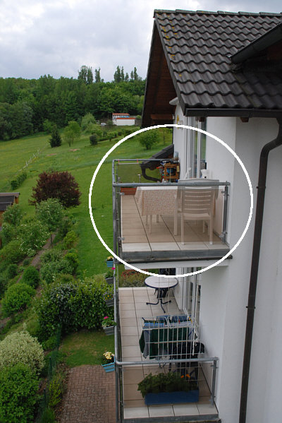 Da oben ist ein Balkon. Auf dem Balkon steht niemand. Aber es ist ein