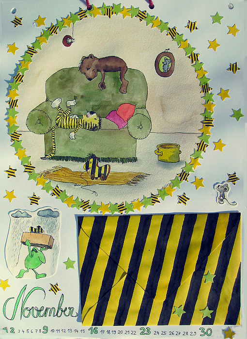 November Wieder sehr aufwändig ... viele, viele Sternchen bilden einen Kreis. Ein bißchen Tigerente, ein bißchen Frosch ... und eine Regenwettertorte. zum Dezember