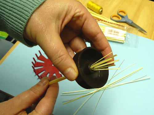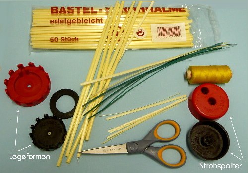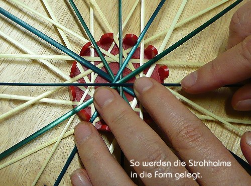 Die einzelnen Strohteile werden im Uhrzeigersinn in die Form eingelegt.