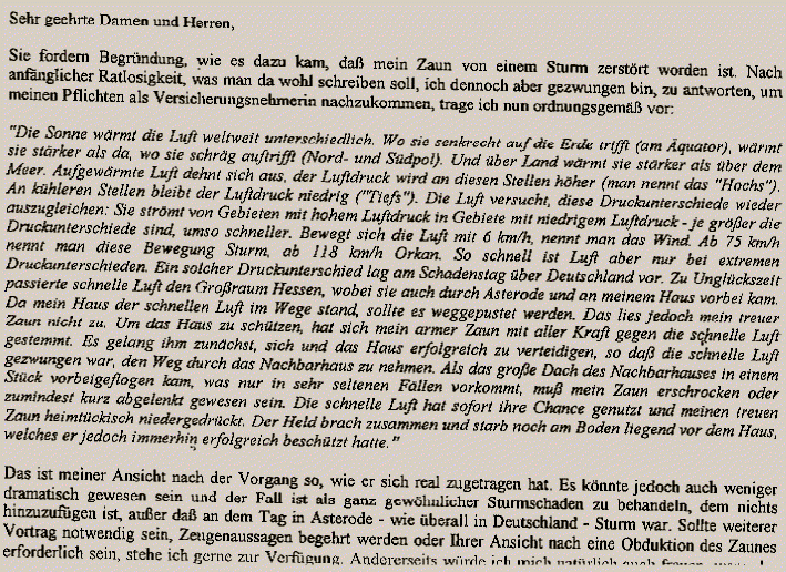 Daraufhin erhielt die Versicherung folgende Antwort: