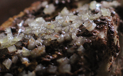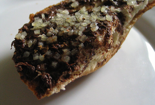 Brötchenhälfte ... mit Nutella ... und viel Knoblauch drauf.