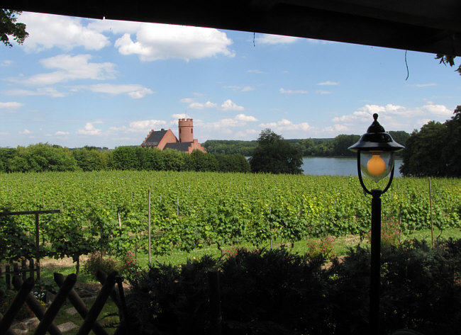 Vor uns ein Weinberg, die Burg Crass und der Vater Rhein.